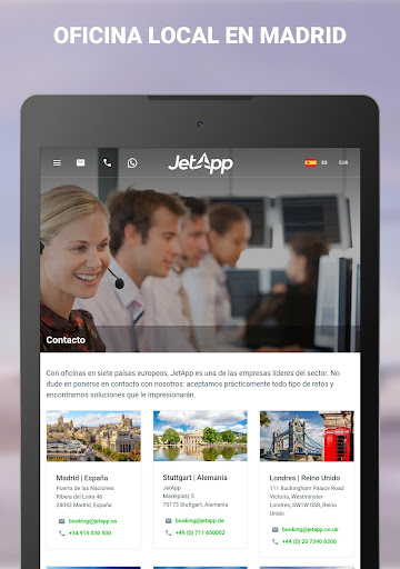 JetApp es totalmente flexible, profesional en cada detalle y siempre a un solo toque en la pantalla de su dispositivo móvil. ¡Esperamos su solicitud!