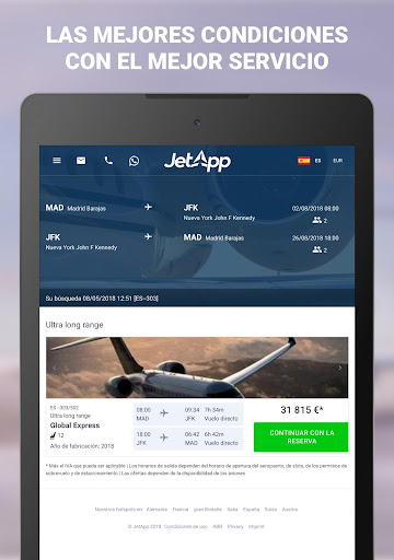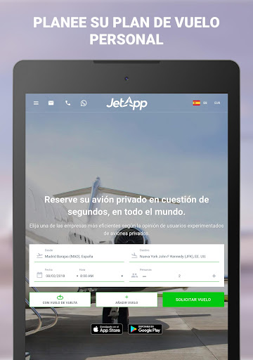 ¿Quiere viajar en un jet privado de forma rápida y cómoda? ¿En todo el mundo y a precios competitivos? ¡Entonces alquile su avión privado fácilmente, ahora a través de una aplicación! JetApp es innovadora, flexible y fiable, y está disponible las 24 horas del día.