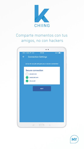 proporciona una conexión segura y rápida usando un canal de cifrado de 128-bit, entre tu dispositivo y la pagina web que accedes usando tecnológica Virtual Private Network (VPN). Esconde tu dirección IP real para que tu dispositivo y tu como usuario no puede ser rastreado. Con K-Chiing también obtendrás acceso a contenido Geo-restringido y comprimirá tus datos para que tu plan sea mas duradero.