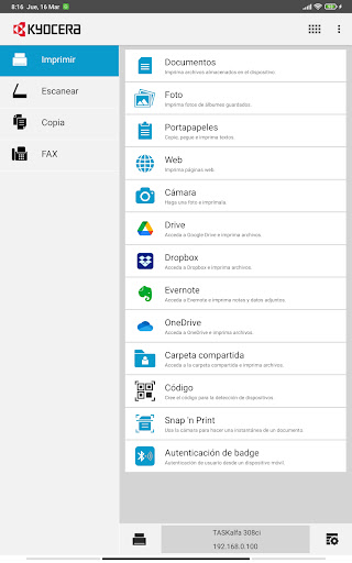 • Imprimir fotos y documentos almacenados en su dispositivo móvil Android. KYOCERA Mobile Print puede imprimir una gran variedad de formatos de archivos, incluso .PDF, .JPG, .PNG, .TIFF y .TXT. También puede imprimir archivos .HTML a una resolución más baja.