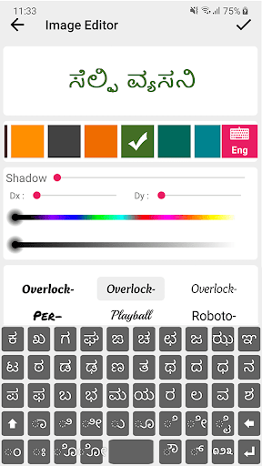 ERASER: Borrar la imagen de la imagen no deseada o el fondo y ajustar el tamaño de la imagen.Texto: escribir texto o título con fuente, estilo y color Kannada.
