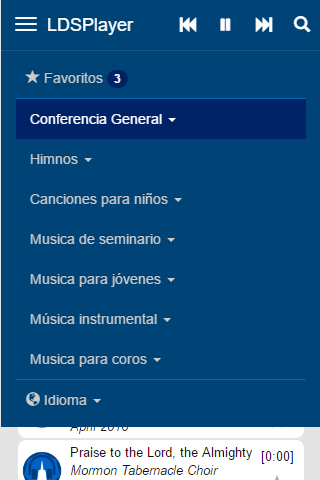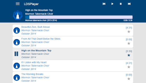 Permite reproducir el catálogo de música obtenida del sitio lds.org, incluyendo música de conferencias generales (Coro del tabernáculo y otros coros) , himnos y canciones de los niños, temas especiales, coros para hombres, coros para mujeres.