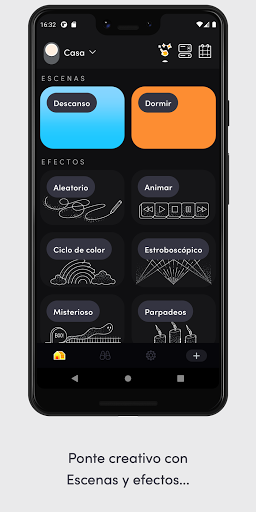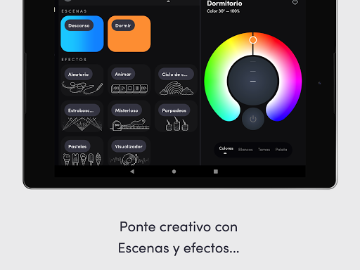 - Efectos: juega con efectos especiales como el visualizador de música, fuego, movimiento, parpadeo de velas, luz estroboscópica, ciclo de color y mucho más, todo desde un único lugar.