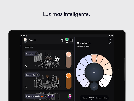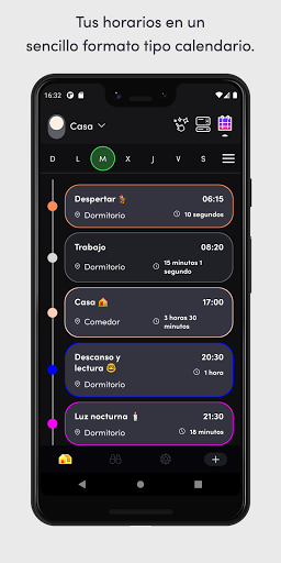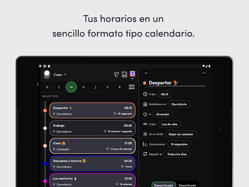- Horarios: automatiza tus luces para que hagan un fundido, cambien de color y se enciendan o apaguen, todo visible en una vista sencilla de estilo calendario.