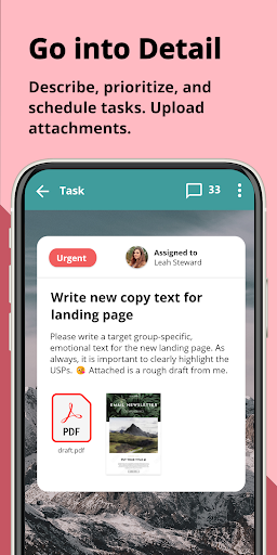 Adjunta archivos a cualquier tarea de tu lista de actividades pendientes. Siéntete libre para adjuntar fotografías o documentos de cualquier tipo. Discute y comenta las tareas de tu lista de pendientes. Añade tantos detalles como quieras.