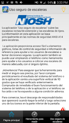 El Instituto Nacional para la Seguridad y Salud Ocupacional (NIOSH) busca garantizar la seguridad de los usuarios de escaleras de extensión al crear y difundir una aplicación para los teléfonos inteligentes, interactiva y fácil de usar, acerca del uso seguro de las escaleras. La aplicación de NIOSH 'Uso seguro de escaleras' tiene un indicador multimodal que utiliza señales visuales y auditivas para ayudar al usuario a colocar la escalera de extensión en un ángulo óptimo. Es más, la aplicación provee materiales de referencia interactivos y gráficos, directrices y listas de control de seguridad para la selección e inspección de una escalera de extensión, así como para su uso y la instalación de accesorios. La aplicación tiene como propósito ayudar a una gran variedad de usuarios, empleadores y profesionales de seguridad con las necesidades de seguridad relacionadas con las escaleras. La aplicación sobre el uso seguro de escaleras también cumple con las normas de la Sección 508 de la Ley de Rehabilitación