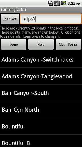 Soporta DD.DDD, DD MMMMM, DD MM SS.SSS, UTM y Maidenhead Locador. Puede cargar puntos de un GPX y / o GUARDAR PUNTOS EN DB local para su uso posterior.
