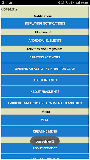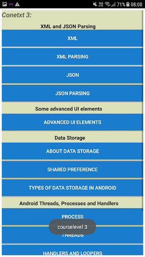 Context 3: This section contains some intermediate concepts required for learning android development to grab a good hold in developing apps. This covers some features that increases the overall impression of your application through some practical manipulations. The concepts covered in this section with practical codes and examples are-