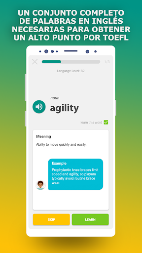 La tecnología de aprender las palabras utilizada en la aplicación le permite aprender rápidamente nuevas palabras en inglés (hasta 3000 palabras por mes), que a menudo se usan en las pruebas de TOEFL, y también memorizar palabras aprendidas durante mucho tiempo.