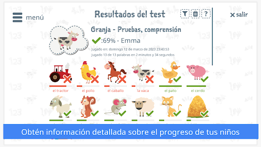 • Realice un seguimiento del progreso del desarrollo del vocabulario a través del informe de resultados de la prueba.