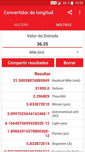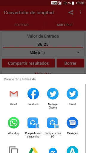 Resultados calculados se pueden compartir en redes sociales, correo, mensajes y otras aplicaciones para compartir.