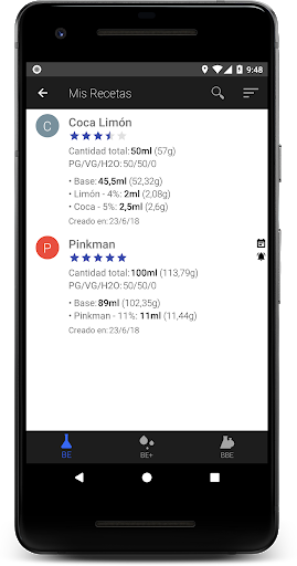 - Toda la información de un vistazo: Cantidad total, tasa de PG/VG/H2O, base y esencia(s) en mililitros y gramos
