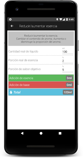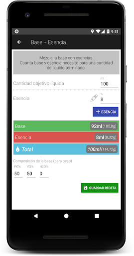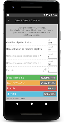 Base Base Esencia: Mezcle varias bases y esencias. Calcula el monto requerido de cada componente para obtener la concentración deseada de nicotina y esencia.