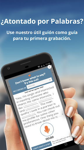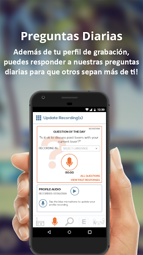 Nuestra aplicación se basa en un nuevo concepto de entretenimiento y citas a través de su voz. El usuario puede seleccionar el idioma de la persona a conocer y luego escuchar las distintas voces hasta que se encuentre y haga clic en su perfil.
