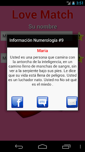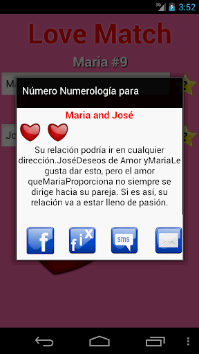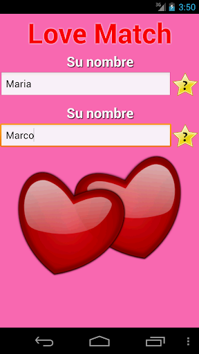 Escriba su nombre y el nombre de su pareja. Después pulse en los corazones. Los resultados se calculan y se muestran en el cuadro de diálogo.