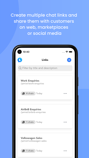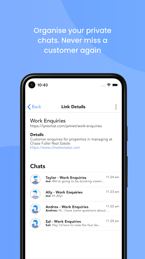 Simplemente instale Lynechat, cree un enlace de chat o "Lyne", y compártelo a través de sus anuncios en línea o perfil de negocios. Ahora los clientes pueden hablarle instantáneamente cuando toquen el enlace y abra una ventana de chat desde su teléfono inteligente o escritorio, directamente a usted, incluso si no tienen la aplicación instalada. Incluso puede incrustar a Lynechat en su sitio web para que su cliente pueda conversar instantáneamente.