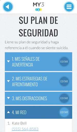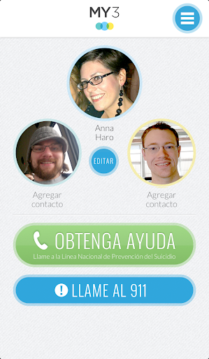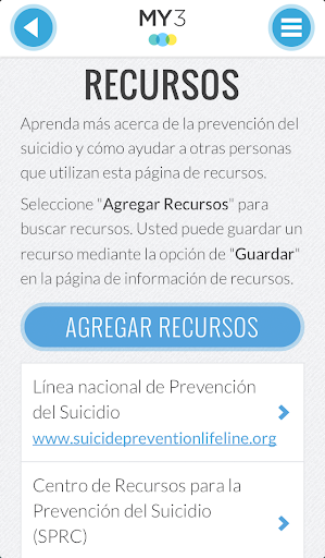 Permanezca conectado a su red cuando se encuentre en momentos de crisis con MY3. Con MY3, usted define su red y su plan para permanecer seguro. Con MY3 puede estar preparado para auto ayuda y llamar a otros cuando tenga pensamientos suicidas.