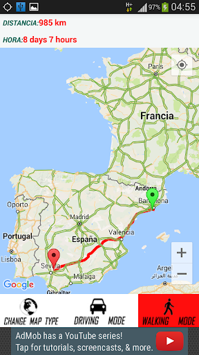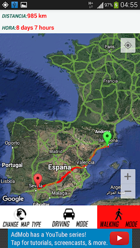 3. Haga clic en la calculadora Distancia entonces Primer seleccionar cualquiera de los dos lugares y el modo (conducir o caminar) elegir, se mostrará la ruta, la distancia y la hora se mostrarán también, con la posibilidad de cambiar los tipos de mapas y de nuevo a la posición actual