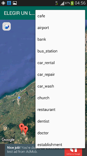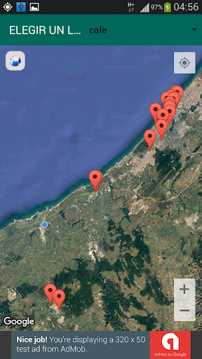 2. Haga clic en Lugares cercanos para obtener la lista de lugares cerca de usted (50000 m) como los cafés, restaurantes, reparación de automóviles, escuelas ... con posibilidad de cambiar los tipos de mapas y de nuevo a la posición actual