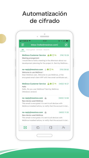 La aplicación MeSign es un cliente de correo electrónico cifrado, gratuito y fácil de usar. No es necesario registrar una nueva cuenta de correo electrónico. Simplemente descargue la aplicación MeSign e inicie sesión con su cuenta de correo electrónico existente. En unos momentos, su certificado de correo electrónico gratuito se instalará automáticamente y podrá comenzar a enviar correos electrónicos encriptados y firmados digitalmente con la misma facilidad que los emails de texto sin cifrar. Sus correos electrónicos se almacenarán en texto cifrado solo en su servidor de correo electrónico. La privacidad de su correo electrónico estará protegida por cifrado de extremo a extremo.