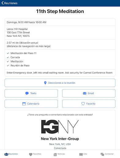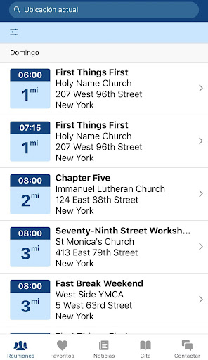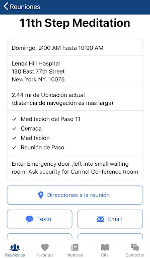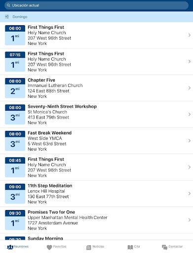 • Si usted decide no compartir su ubicación, aún puede encontrar reuniones introduciendo una dirección en la barra de búsqueda, en cuyo caso usted recibirá una lista de las reuniones cercanas a la ubicación que usted introdujo.