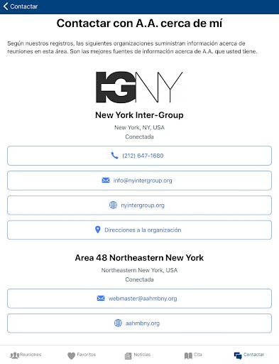 Se incluyen actualmente más de 100,000 reuniones de A.A. La información se actualiza dos veces al día y se les transmite a ustedes información de más de 400 entidades de servicio de A.A.; de sitios web de área, distrito, intergrupo/oficinas centrales y Oficinas de Servicios Generales internacionales (algunas aparecen listadas en A.A. cerca de usted).