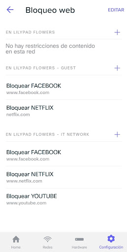 * Dar prioridad de ancho de banda, establecer límites de uso, o bloquear sitios web con facilidad