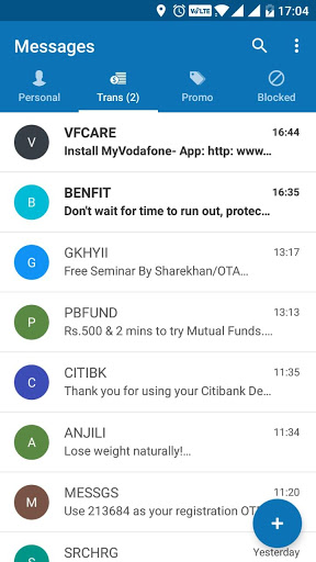 Messages makes SMS the new power app. Get all your notifications neatly categorized into personal, promotional and transactional tab. A clean inbox that helps you stay on top of your communication. A clean and innovative UI makes your regular dull SMS app more interesting and user friendly. A must app to ensure nothing gets missed.