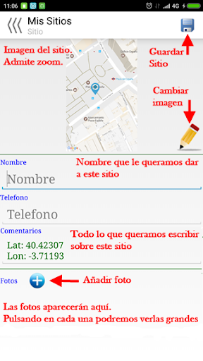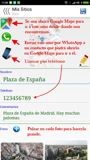 A cada sitio puedes ponerle una foto personalizada y ademas adjuntarle todas las fotos que quieras. También puedes introducir su teléfono para poder llamar directamente desde la aplicación.