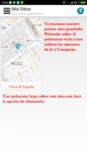 Esta aplicación sirve para guardar en tu dispositivo tus sitios de interés, hoteles, restaurantes, parques, monumentos, casa de familiares y amigos, etc. para después poder ir a ellos de la forma mas fácil, pulsando un solo botón. Además podrás compartirlos por WhatsApp con tus contactos de forma que ellos también podrán ir a ese sitio con un solo toque.