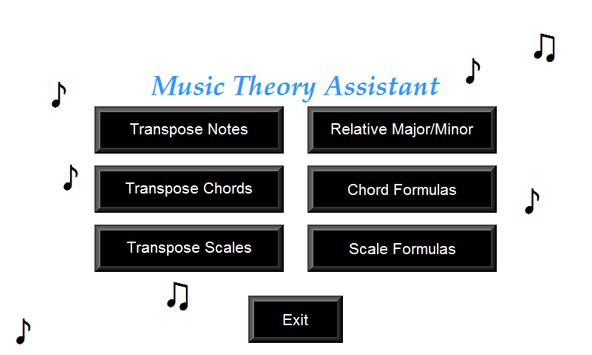 Music Theory Assistant gives you a quick and simple way to look up which notes, chords, and scales may be played in each key. It will also help you transpose notes, chords, and scales from one key to another. You can transpose single notes, 62 different chords per key, or 15 different scales per key easily, simultaneously, and immediately. There is also a list of chord formulas, a list of scale formulas, and a relative major/minor chart so that you can conveniently look up this information when you want to. You can also study the information and memorize it so that you will remember which notes, chords, and scales can be used when you are writing a song in your favorite key.