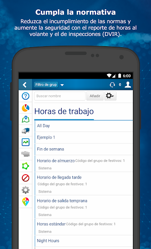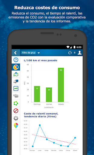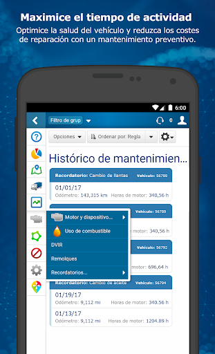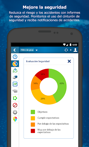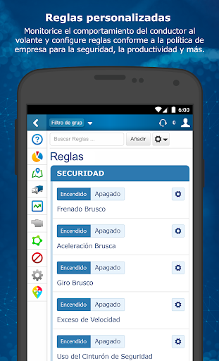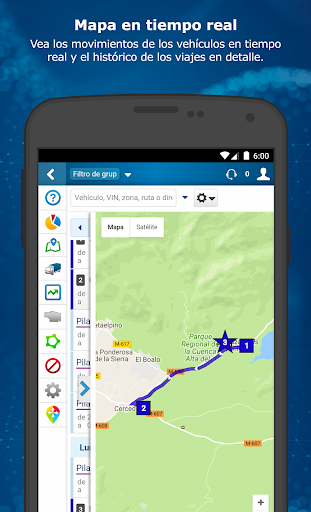 Haga un seguimiento de la ubicación por GPS en tiempo real en el mapa en vivo y consulte el histórico de viajes para cada vehículo. Establezca reglas y notificaciones personalizadas para su empresa para distintos elementos: la ubicación, la actividad, los excesos de velocidad, el frenado brusco y el uso del cinturón de seguridad.