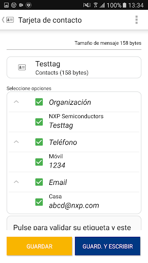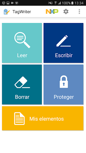La NFC TagWriter de NXP almacena contactos, favoritos, ubicación geográfica, Bluetooth Handover, SMS, correos electrónicos, mensajes de texto y mucho más a cualquier etiqueta NFC, así como a carteles, tarjetas de visita, relojes y otros dispositivos con electrónica NFC. Una vez que los datos se han almacenado la aplicación permite también la lectura y la visualización de los datos programados incluyendo opciones para iniciar aplicaciones automáticamente en función de los datos contenidos.