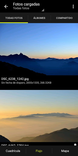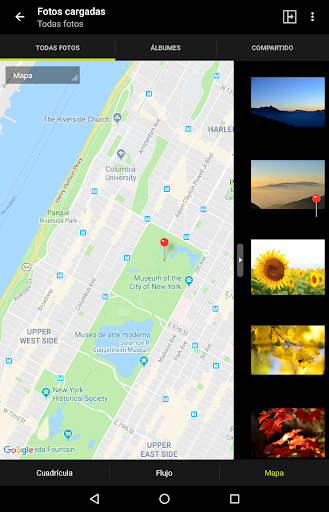 - Puede elegir cualquiera de los tres tipos de visualización disponibles (Cuadrícula/Flujo/Mapa) para ver sus fotos como usted prefiera.