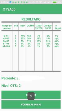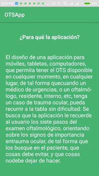 El diseño de una aplicación que permite tener el OTS disponible en cualquier momento, en cualquier lugar, de tal forma que cuando un médico de urgencias, o un oftalmólogo, residente, interno, etc, tenga un caso de trauma ocular, pueda recurrir a la tabla sin dificultad: Se busca que la aplicación le recuerde al usuario los siete pasos del examen oftalmológico, orientando sobre los signos de importancia en trauma ocular, de tal forma que los busque en el paciente, que cosas debe evitar, y que cosas no debe dejar de hacer.