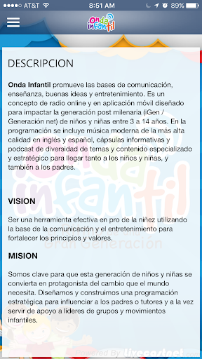 Onda Infantil promueve las bases de comunicación, enseñanza, buenas ideas y entretenimiento. Es un concepto de radio online y en aplicación móvil diseñado para impactar la generación post milenaria (iGen / Generación net) de niños y niñas entre 3 a 14 años. En la programación se incluye música moderna de la más alta calidad en inglés y español, cápsulas informativas y podcast de diversidad de temas y contenido especializado y estratégico para llegar tanto a los niños y niñas, y también a los padres.