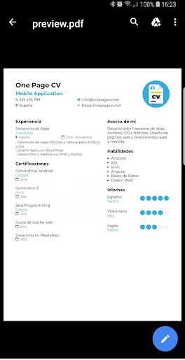 Puedes ver una vista previa del currículum generado en PDF y luego enviarlo a alguien, subirlo a la nube o lo que quieras.