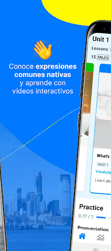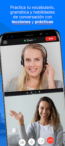 - Prácticas: actividades interactivas con contenido moderno y actualizado para aprender inglés; videos, chats en grupo y herramientas avanzadas de reconocimiento del habla.