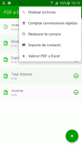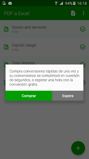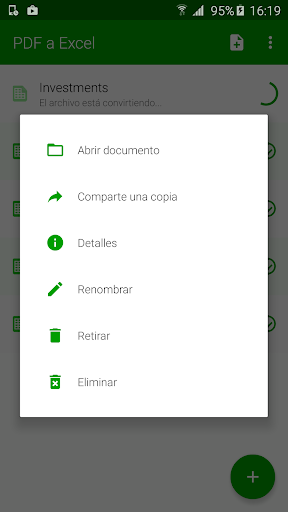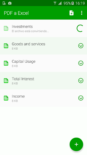 El más elogiado convertidor de PDF a Excel en el mercado. Use y edite sus documentos de PDF. El convertidor de PDF a Excel permite a los usuarios convertir sus textos PDF, formularios y tablas a Microsoft Excel. Toque en el botón para añadir el archivo para la conversión. Luego se envía automáticamente a nuestros servidores para la conversión. El archivo se descarga una vez que la conversión se realiza. Conversión de PDF a Excel no se realiza en el dispositivo para no utilizar los recursos de su dispositivo o drenar su batería.