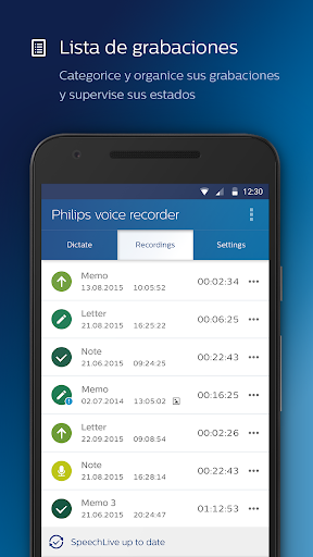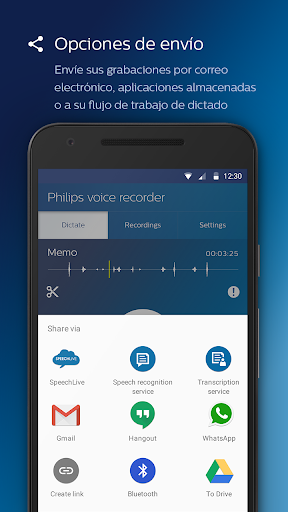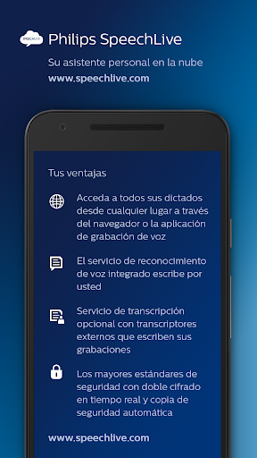 - Envíe sus dictados a SpeechLive y estarán disponibles en la nueva aplicación: https://play.google.com/store/apps/details?id=com.philips.dictation.speechlive