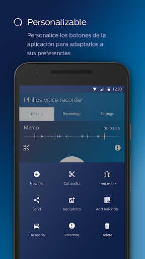 La aplicación grabadora de voz de Philips ofrece calidad de grabación de primera clase, funciones profesionales como insertar o cortar secuencias y una operación intuitiva. Las grabaciones se pueden enviar fácilmente a través de correo electrónico, Dropbox, Google Drive, etc. Para una seguridad máxima, gestión de ficheros basada en navegador web, servicios adicionales como reconocimiento de voz; recomendamos su uso con nuestro servicio Philips SpeechLive.