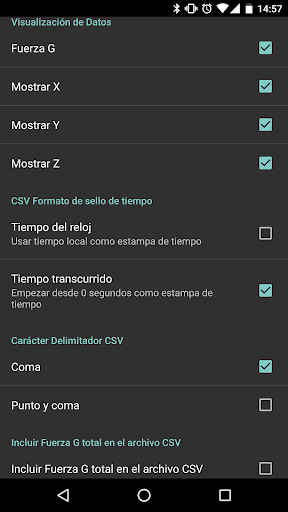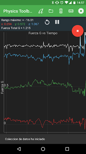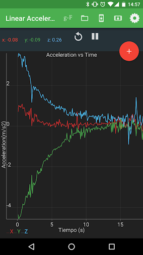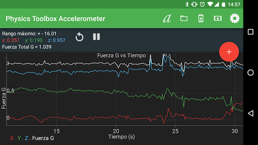 Esta aplicacion del sensor acelerómetro muestra una gráfica de Fuerza G vs. Tiempo (s) y aceleración (m / s / s) vs. Tiempo (s) en x, y, z, así como la magnitud total de la fuerza G . Los datos se puede grabar y exportar como un archivo adjunto .csv utilizando una coma o un punto como delimitador del archivo .csv.