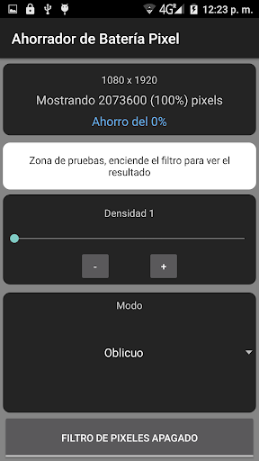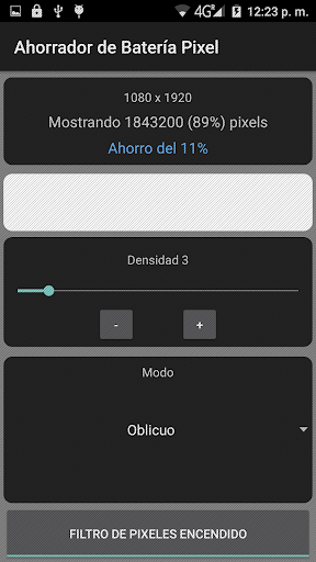 Esta aplicación permite apagar píxeles de la pantalla con cuatro modos y 19 niveles de intensidad diferentes para poder ahorrar batería, cuantos más píxeles se apaguen más batería se podrá ahorrar.