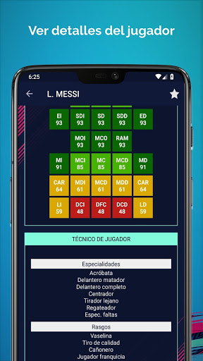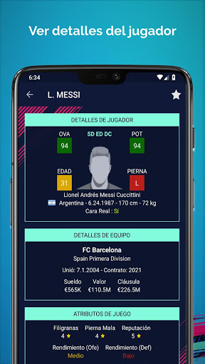 En la pantalla de Detalles de Jugador, eres capaz de mostrar datos muy detallados como Foto del Jugador, Nombre Completo, Posiciones Preferidas, Fecha de Nacimiento, Altura, Peso, Fecha de Expiración de Contrato, Sueldo, Valor, Cláusula de Rescisión, Especialidades, Rasgos, Pierna Mala, Filigranas, Rendimientos y Clasificación de Jugadores Por Posiciones.