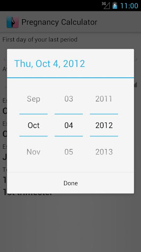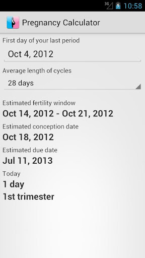 Descargar esta calculadora de embarazo en el dispositivo y siempre será capaz de determinar la fecha de concepción, qué tan avanzada se encuentra y la fecha aproximada del parto de su bebé.