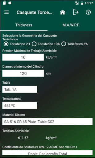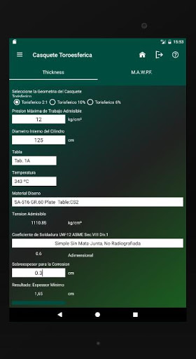 Es posible calcular la presión de trabajo máxima permisible según el espesor mínimo requerido o realizar una verificación inversa.