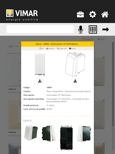 La aplicación Productos Vimar permite obtener toda la información de cada producto, en tiempo real y de forma sincronizada con la página oficial: