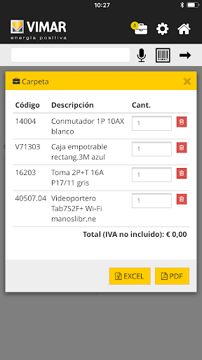 - Carpeta con lista de productos y descarga XLSX o PDF.