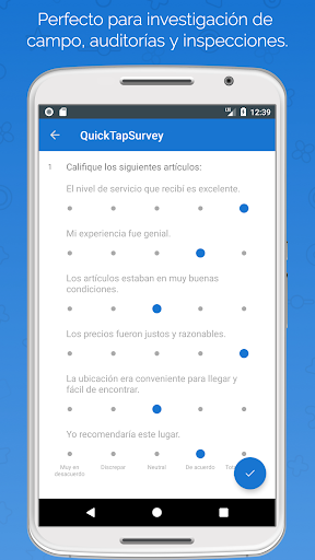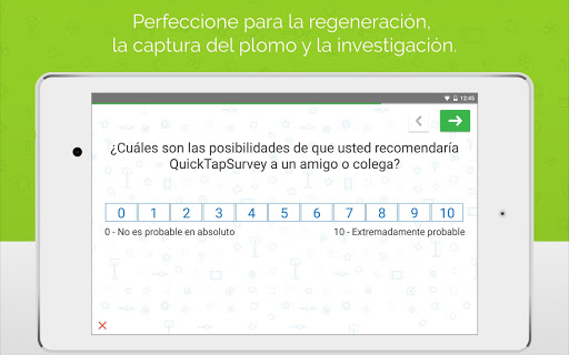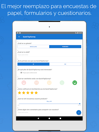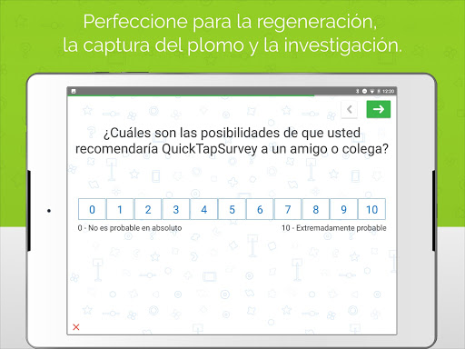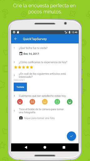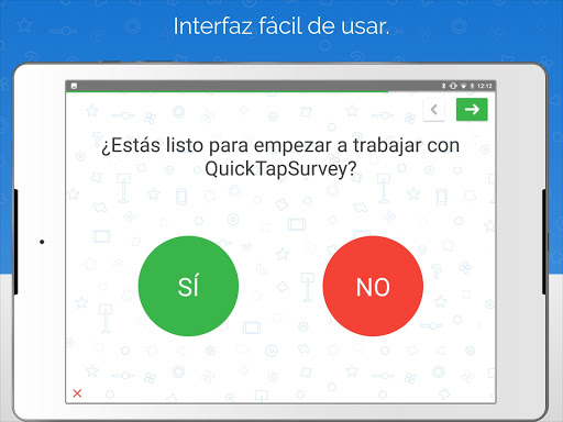 QuickTapSurvey es una plataforma móvil para encuestas y recolección de datos que permite a los usuarios crear sus propias encuestas y juntar respuestas utilizando tabletas sin conexión a Internet. Es la aplicación de encuestas con más alto puntaje y es utilizada por miles de organizaciones en más de 50 países alrededor del mundo. ¡Pruébela GRATIS ahora!