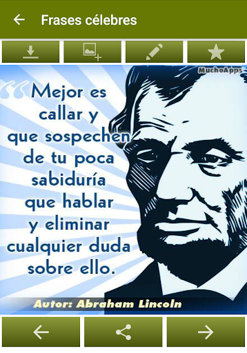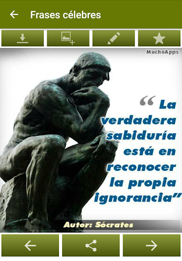Nota legal: Todas las imágenes de frases célebres que se encuentran en esta aplicación han sido creadas por diseñadores en exclusiva para MuchoApps, por lo que está prohibido el uso comercial de cualquier imagen que se encuentre dentro de este programa sin el previo consentimiento de MuchoApps.